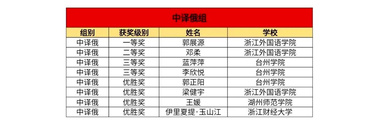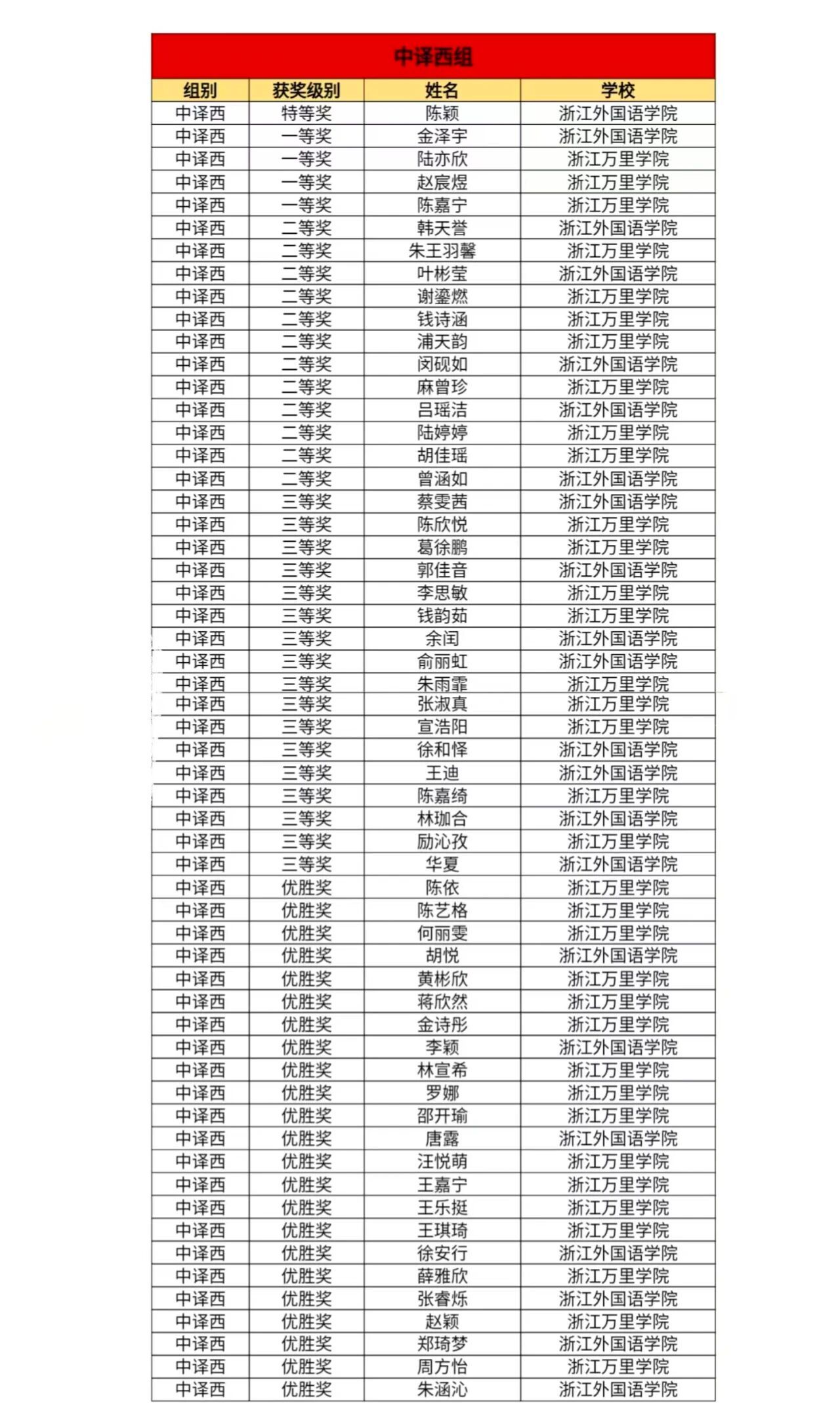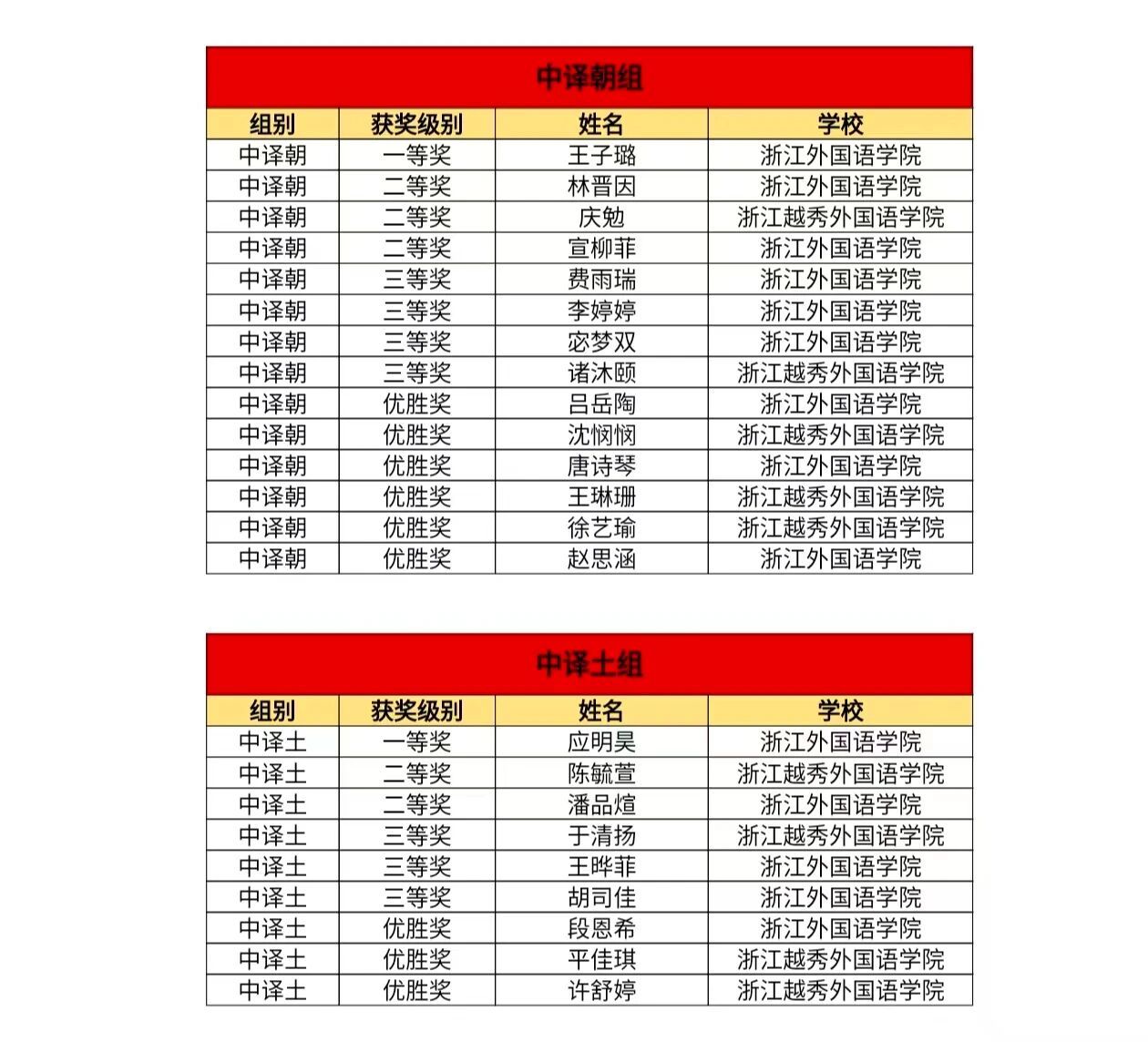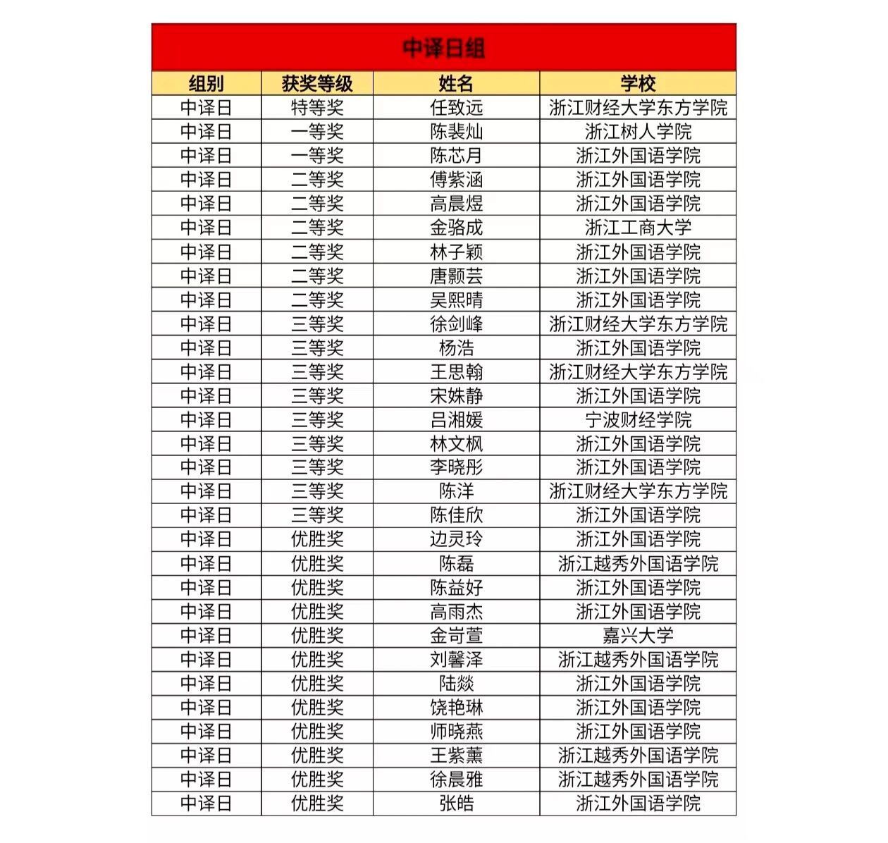大赛自5月启动以来,得到了省内高校外语类院系的广泛关注与积极参与。大赛设立中译日、中译阿、中译朝、中译土、中译俄、中译德、中译西、中译法、中译意、中译葡、中译捷、中译波、中译越13个本科组别,共有来自13所高校的412余名在校本科生报名参加。经过专家评审,共评出特等奖3名、一等奖18名、二等奖44名、三等奖62名、优胜奖86名。各组别获奖名单如下: