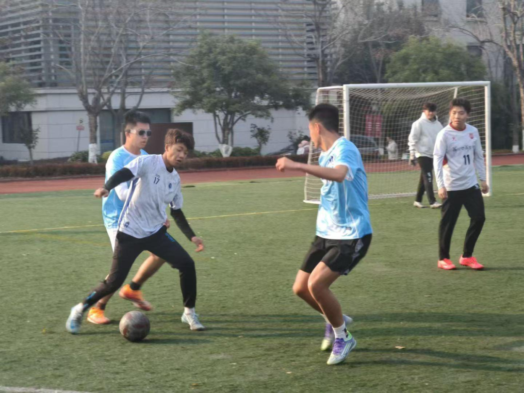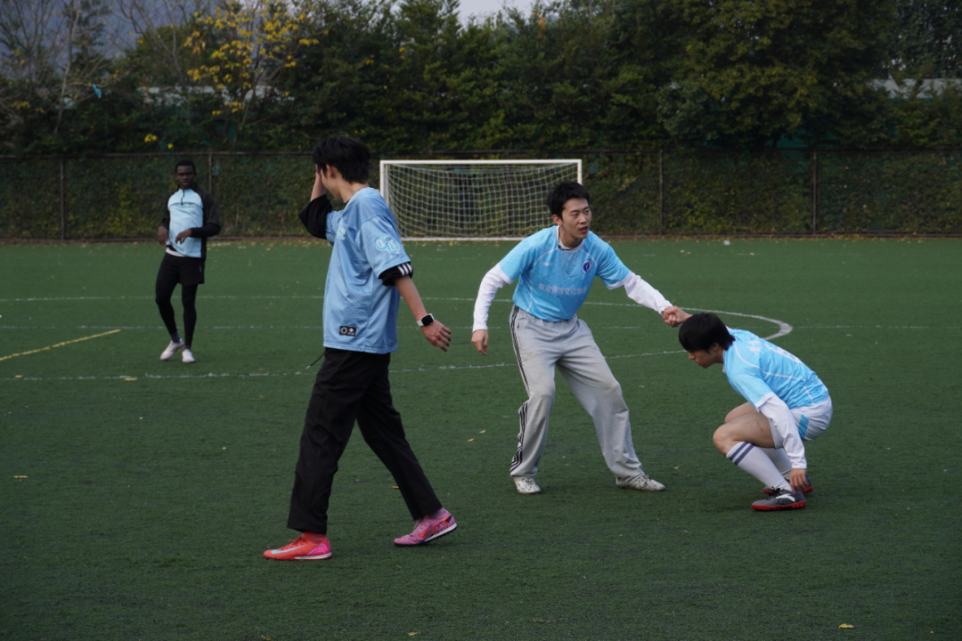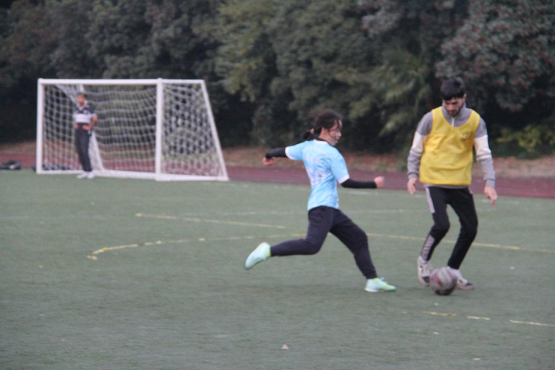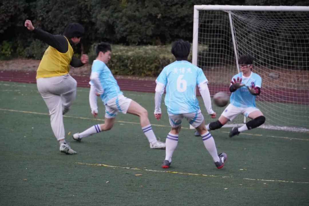 12月3日,首战英文学院足球队。开场后因配合稍欠默契连续失球,士气一度低落。关键时刻,队长王弈恺迅速召集队员复盘调整战术、更换阵容,队员们重拾斗志,舍身封堵、拼命回追,场下替补与观众的呐喊助威声此起彼伏。虽最终未能取胜,但不惧强敌、顽强拼搏的精神已然闪耀赛场。