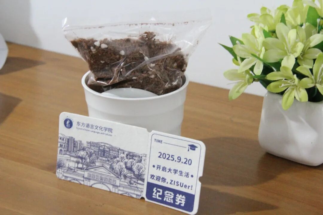 这份特殊的礼物寓意着生命的开始与无限的希望。花盆是归属,代表学院这片成长的沃土;种子是潜力,象征每一位新生蕴含的无限可能;花土是滋养,代表师长的教诲与同窗的情谊。