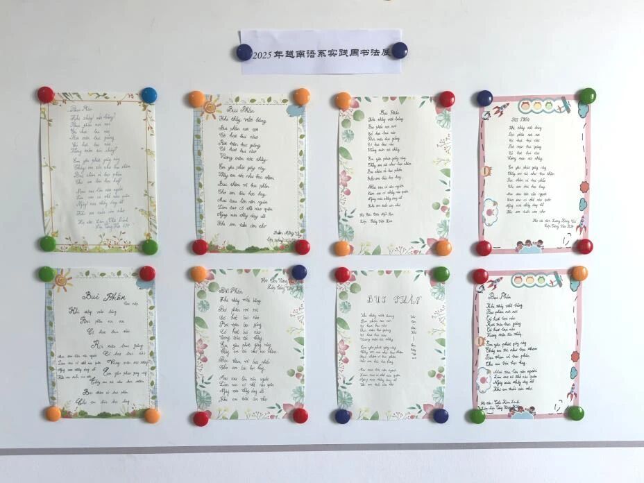 本次实践周中的越南语书法比赛,让班级同学沉潜于专业技能的精细化练习。活动中,同学们跳出电子化输入的习惯,以纸笔书写越南语文字,相互观摩字帖、交流笔法心得,不再将越南语视为工具性能,而是共同体会到越南语文字的形体美感与文化意蕴。