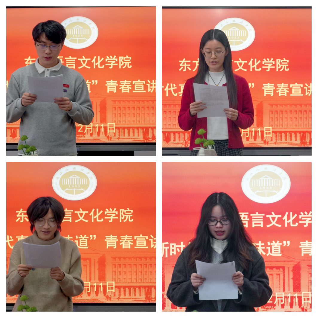 在融院C304举办“新时代真理的味道”青春宣讲活动。学校“青学”宣讲团四位成员高卓、童雅茹、张宸嘉、姚晨雨分别进行主题宣讲。学院党委书记夏颐,党委副书记宋洋,辅导员蔡胜、高卓以及本科和研究生代表共30余名师生参加宣讲活动。