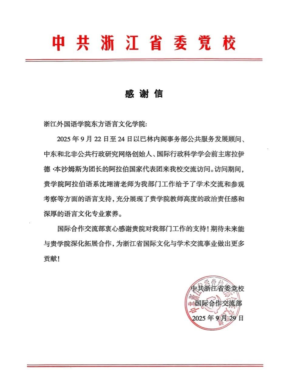 收到中共浙江省党校国际合作交流部发来的感谢信,对9月22日至24日阿拉伯国家代表团访问浙江期间,澳门六合彩内幕资料
